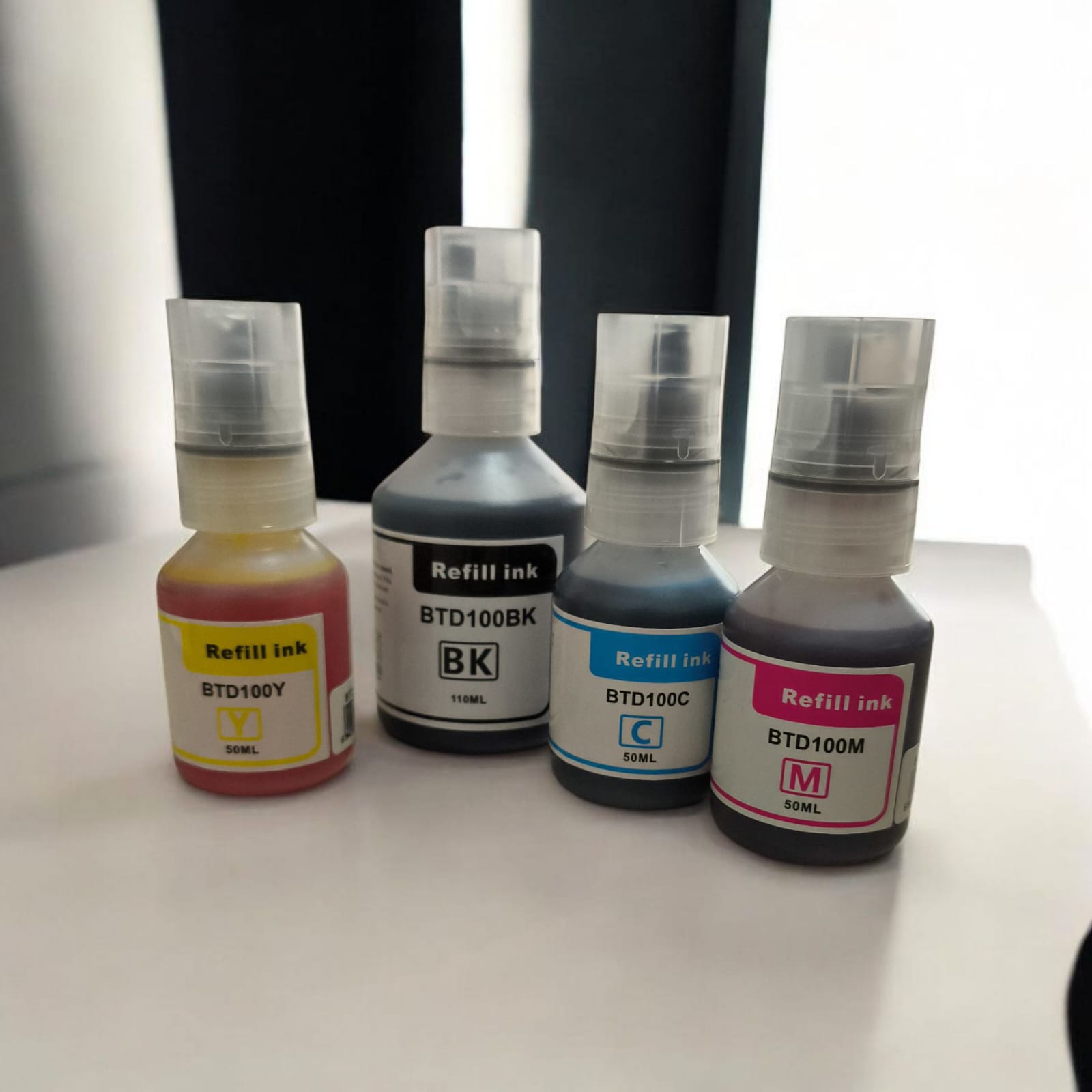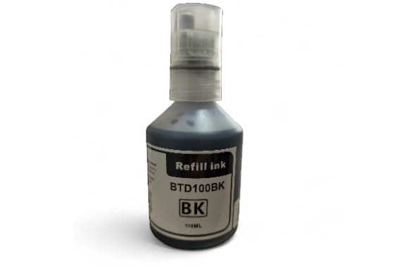 Nuestra Botella de Tinta Brother BTD100 Negra Alternativa compatible con impresoras Brother MFC-T930DW, DCP-T830DW, DCP-T730DW, DCP-T530DW, DCP-T430W, DCP-T230, DCP-T536DW y otros, con contenido de 100 ml y rendimiento de 7.500 paginas. Excelente opcion para un volumen de impresion de un hogar, negocio o empresa con calidad profesional y menor costo por impresión.